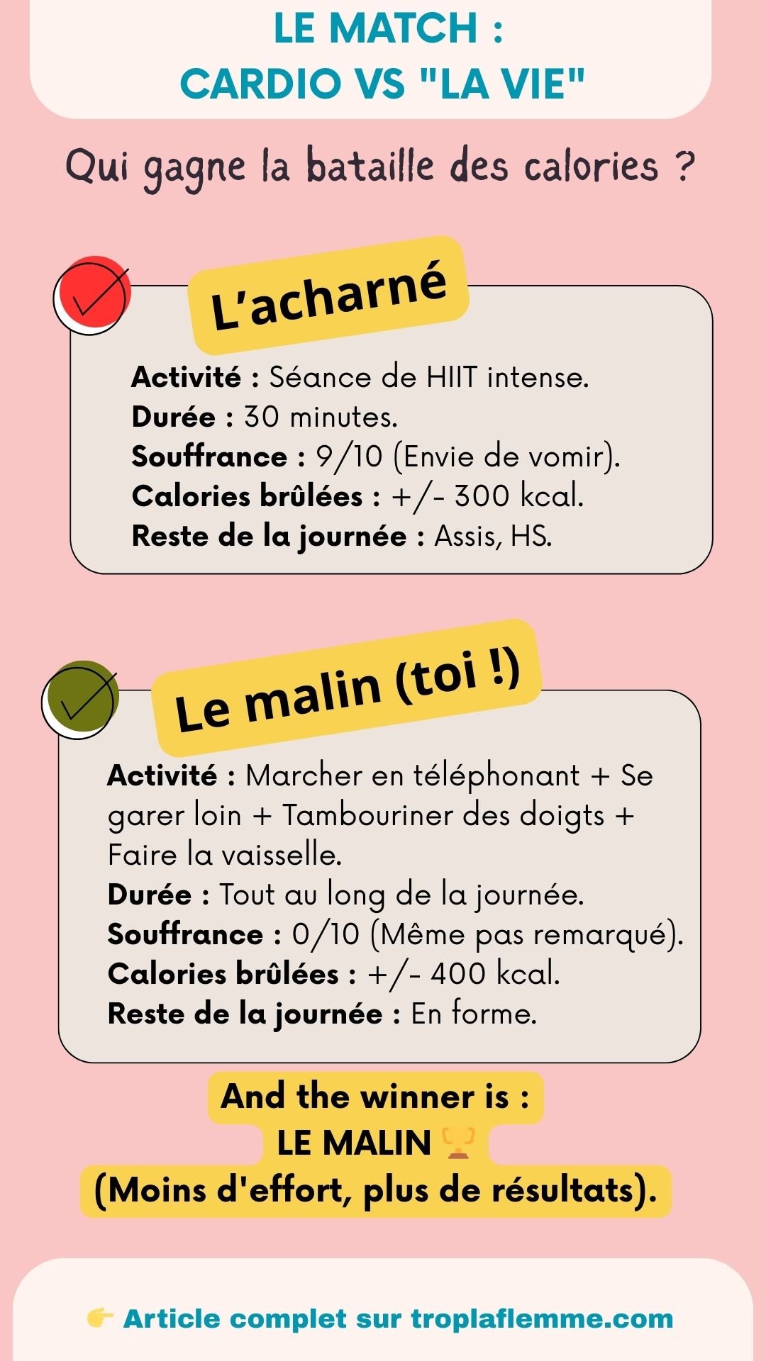 Voici le secret : une séance de sport dure 1 heure. Ta journée dure 24 heures. Si tu es une larve amorphe pendant 23h et que tu te tues au sport pendant 1h, tu brûleras MOINS qu’une personne qui ne fait jamais de « vrai sport » mais qui bouge un peu toute la journée.
