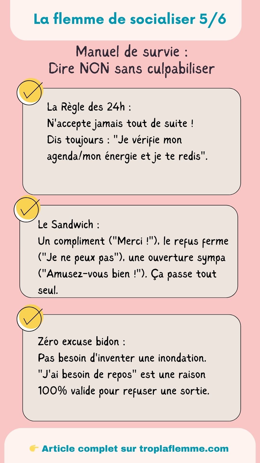 Note importante : Tu n’as pas besoin de te justifier ! « Je ne suis pas dispo » est une phrase complète. Tu n’as pas à expliquer que ta « non-disponibilité » consiste à manger des pâtes en pyjama devant Netflix. C’est un rendez-vous avec toi-même, ça compte.